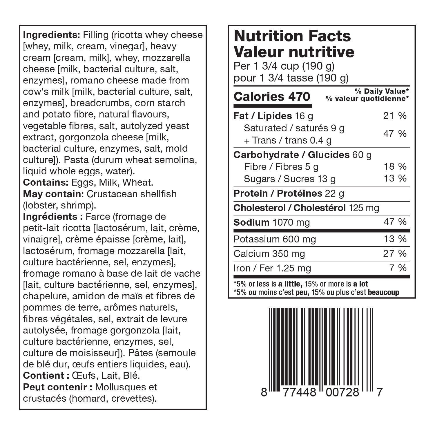 Filling (ricotta whey cheese [whey, milk, cream, vinegar], heavy cream [cream, milk], whey, mozzarella cheese [milk, bacterial culture, salt, enzymes], romano cheese made from cow's milk [milk, bacterial culture, salt, enzymes], breadcrumbs, corn starch and potato fibre, natural flavours, vegetable fibre, salt, autolyzed yeast extract, gorgonzola cheese [milk, bacterial culture, enzymes, salt, mold culture]). Pasta (durum wheat semolina, liquid whole eggs, water). Contains: Eggs, Milk, Wheat. May contain: Crustacean shellfish (lobster, shrimp).