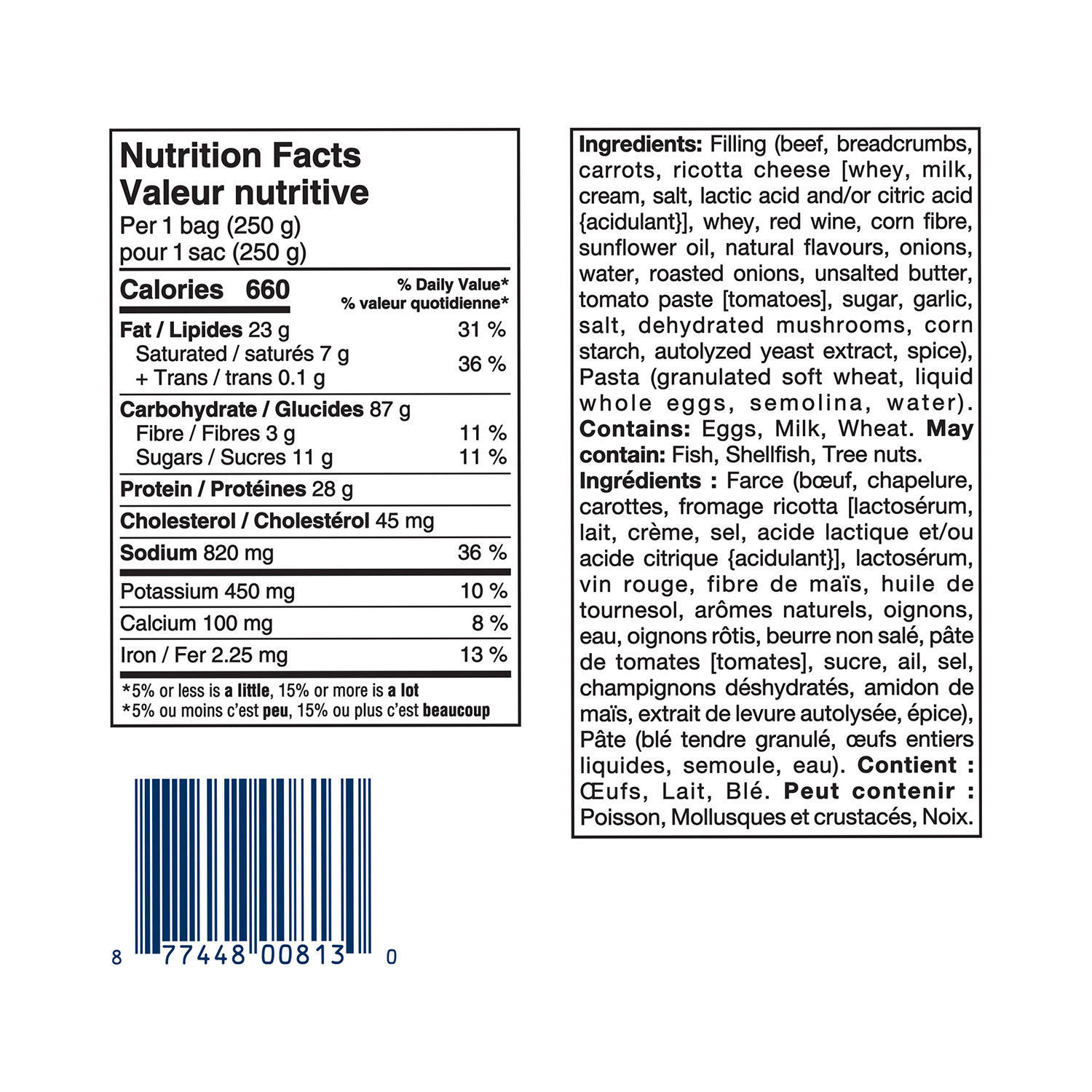 Filling (cooked ground beef with natural juices [beef, salt], ricotta whey cheese [whey, milk, cream, vinegar], carrots, sunflower oil, whey, beef stock [beef stock, water, sea salt, beef, yeast extract, flavour, sugar, onion powder, onion juice concentrate, carrot puree, celery juice], red wine, onions, breadcrumbs, dehydrated potatoes, cellulose and psyllium fibres, potato starch, tomato paste [tomatoes], vegetable base [maltodextrin, onion extract, sauteed onion, sugar, salt, yeast extract, corn oil, carrot extract, celery extract, spices, garlic powder, red wine], garlic, natural flavours, salt, spices).