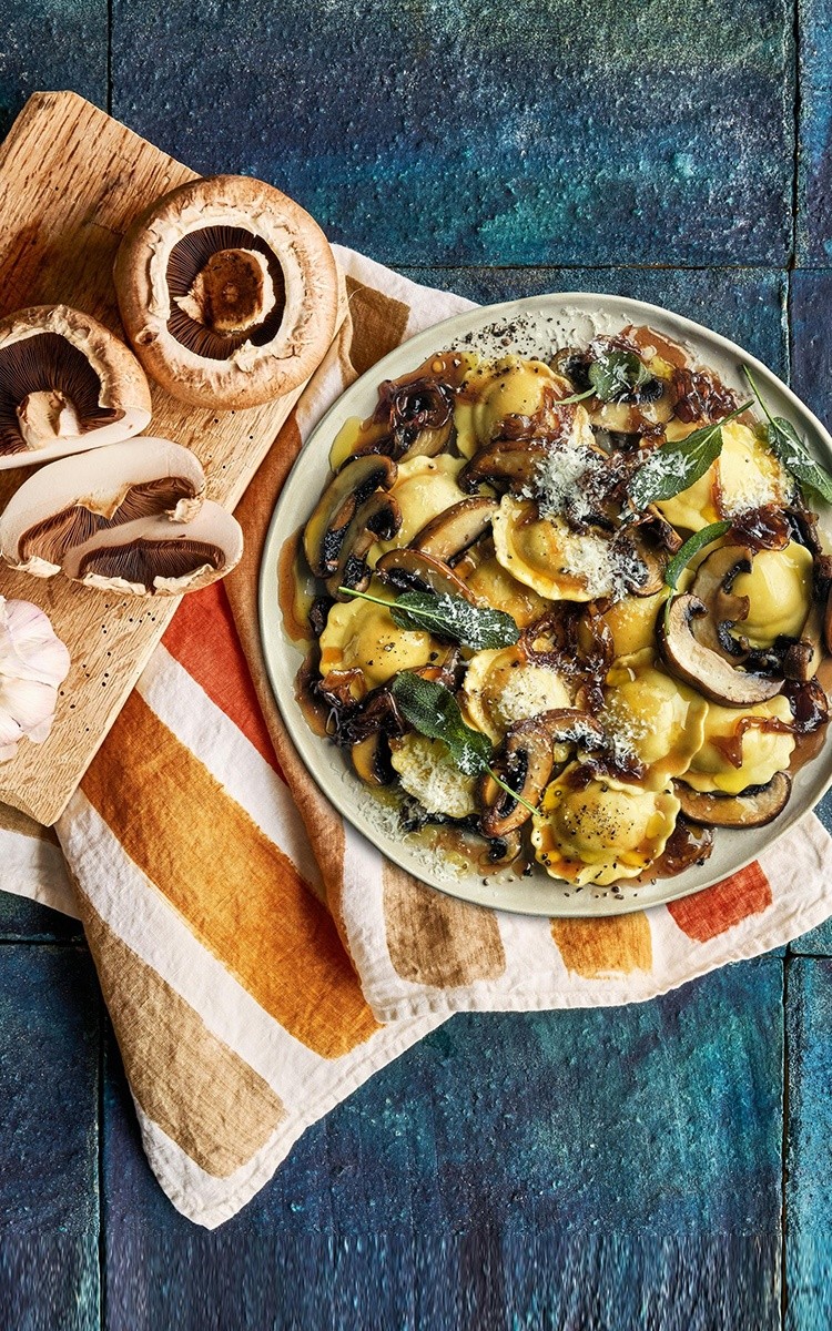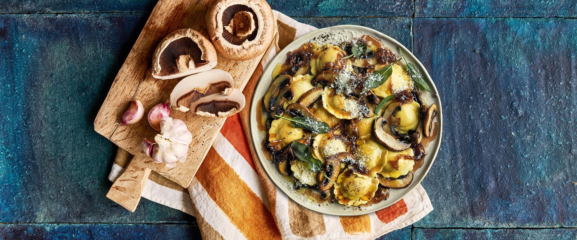 BRAISED BEEF RAVIOLI CARAMELIZED ONIONS AND SAUTÉ PORTABELLO