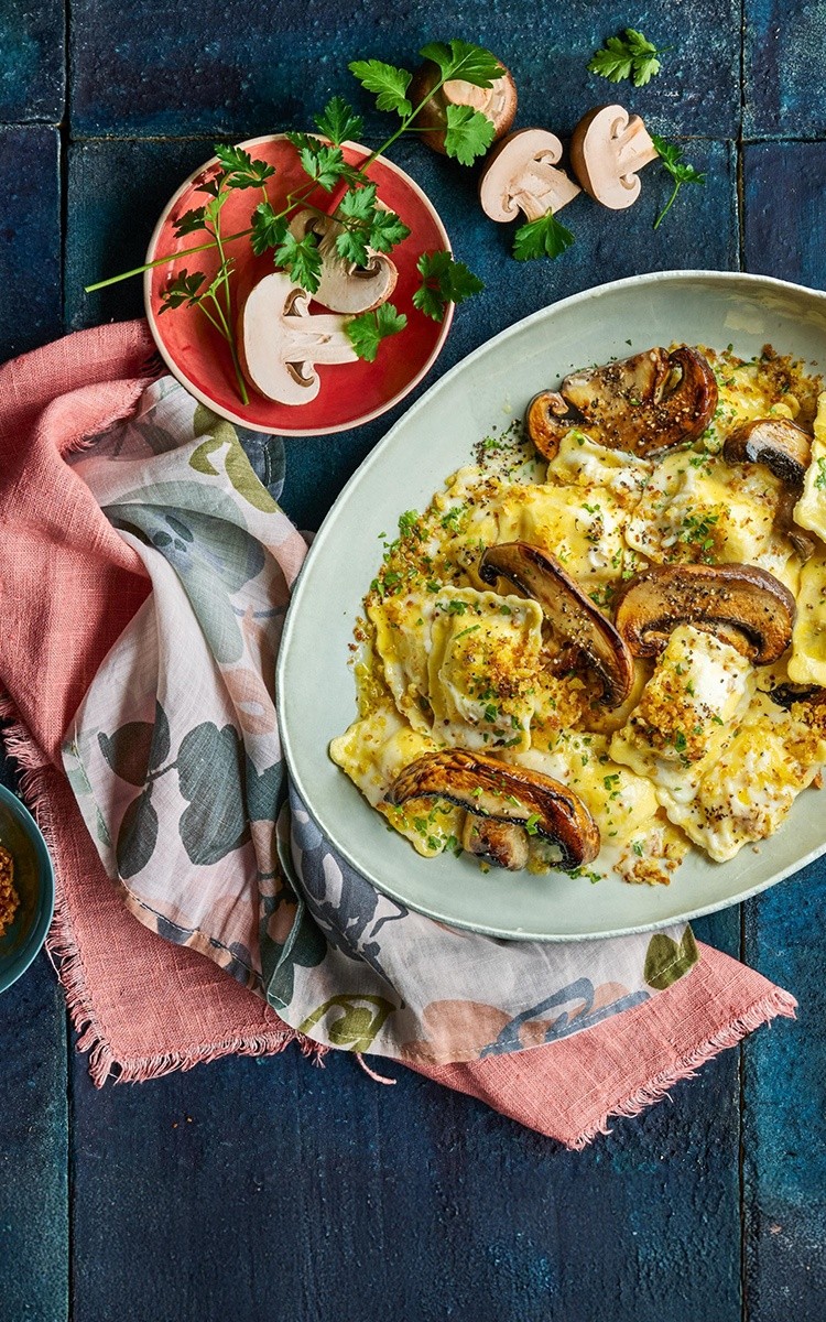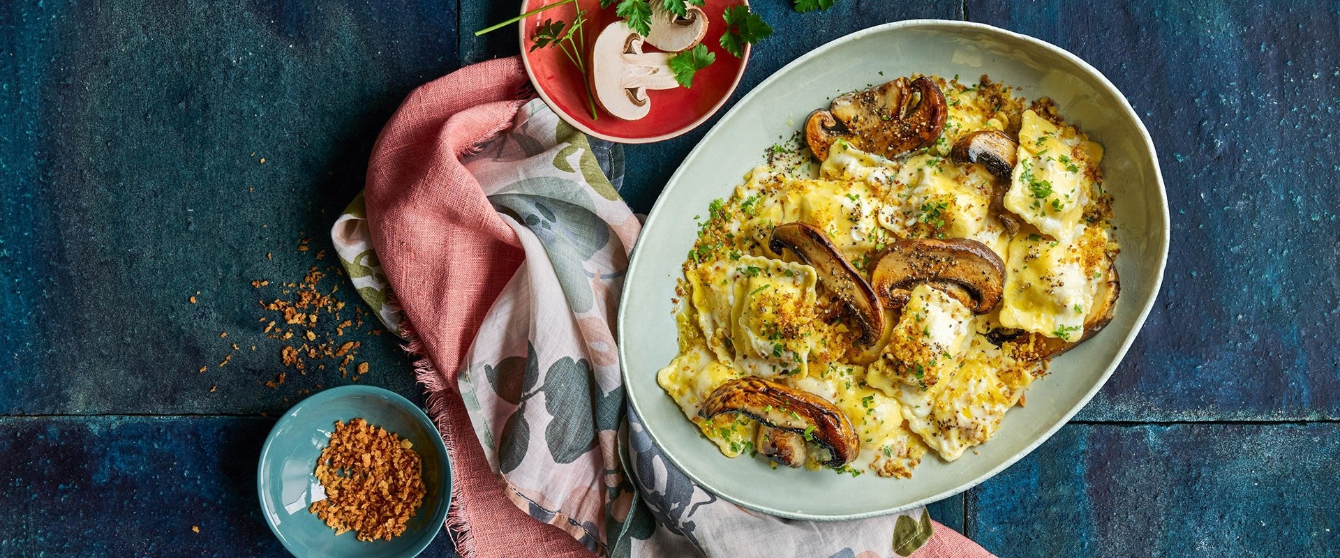 CHICKEN & ROASTED GARLIC RAVIOLI ALFREDO SAUCE, MUSHROOM & BREADCRUMBS