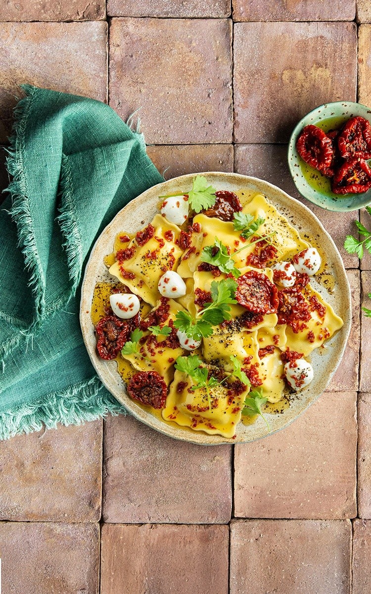Strain and gently toss ravioli in the pan with the sundried tomatoes