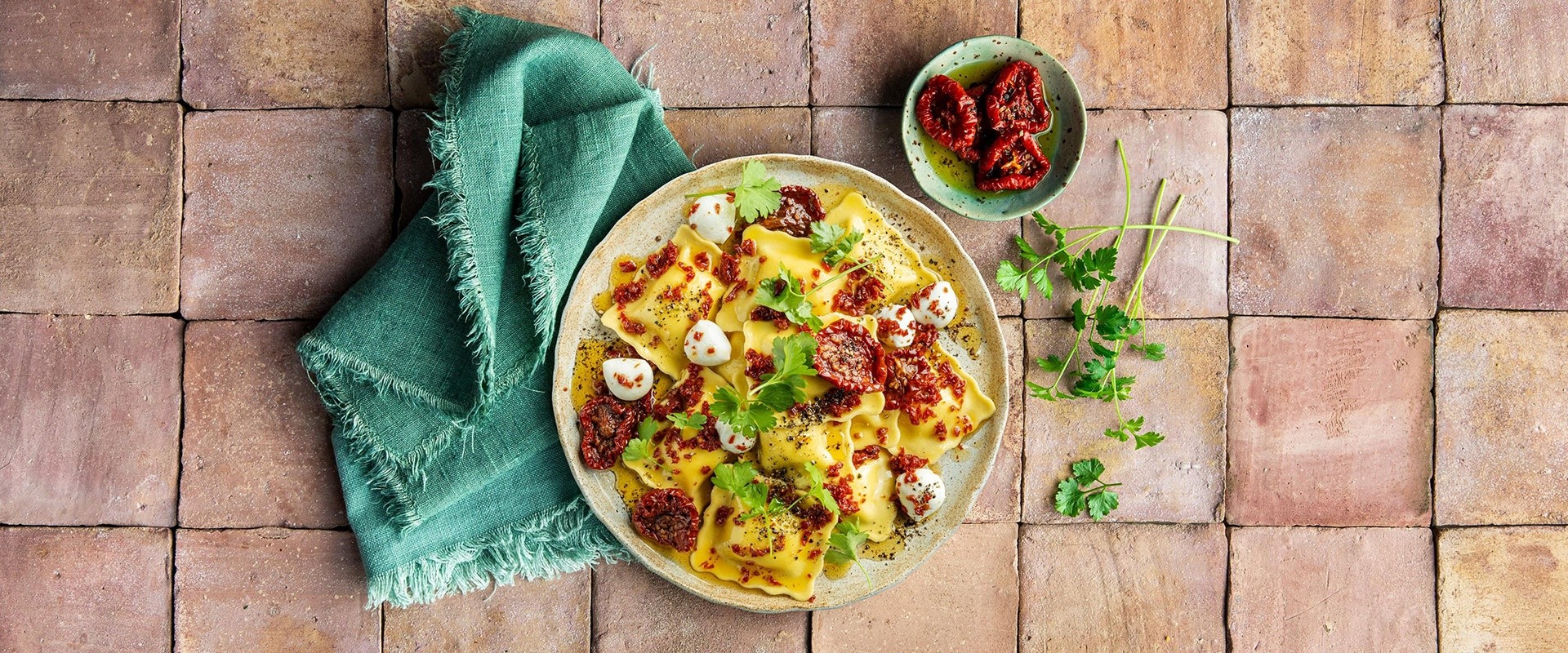 CHICKEN & ROASTED GARLIC RAVIOLI, SUNDRIED TOMATOES & MOZZARELLA
