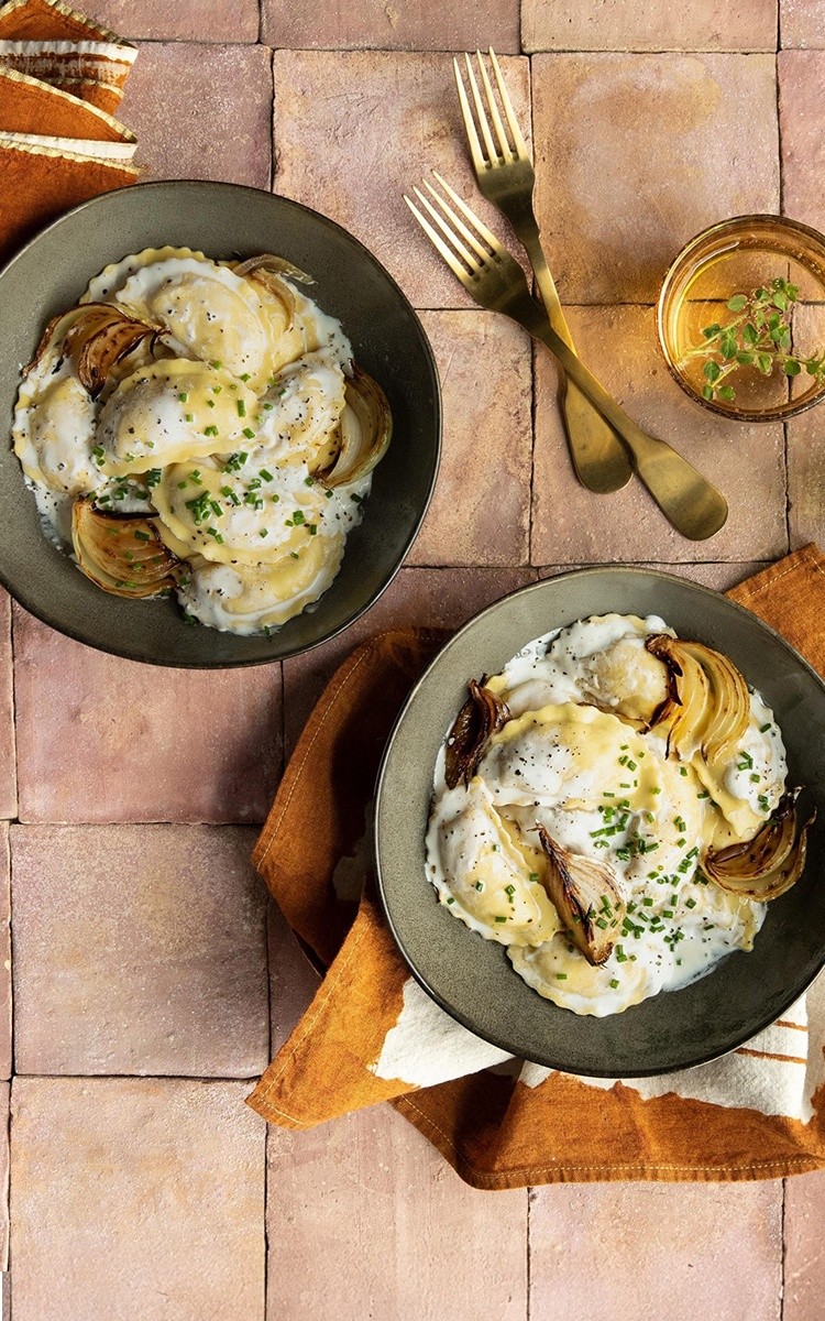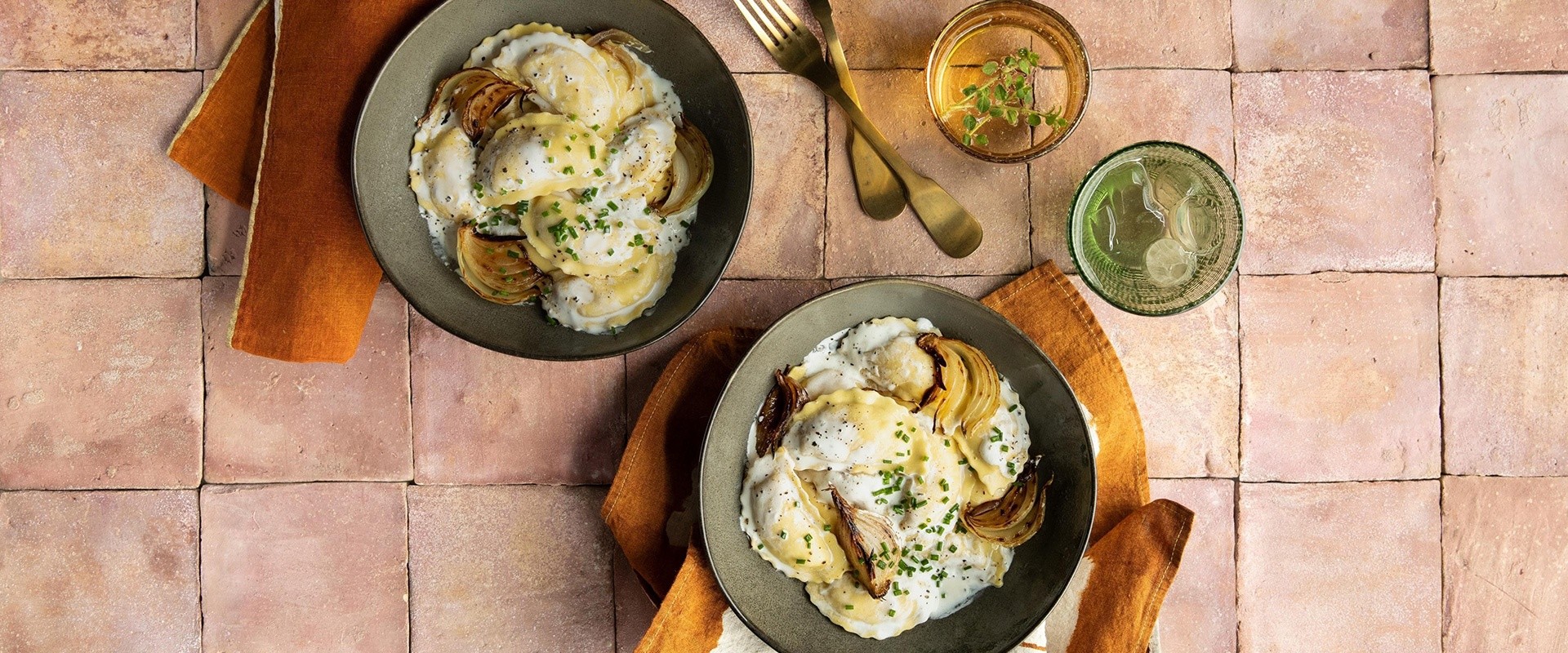 ITALIAN SAUSAGE RAVIOLI, SOUR CREAM, CARAMELIZED ONIONS & CHIVES