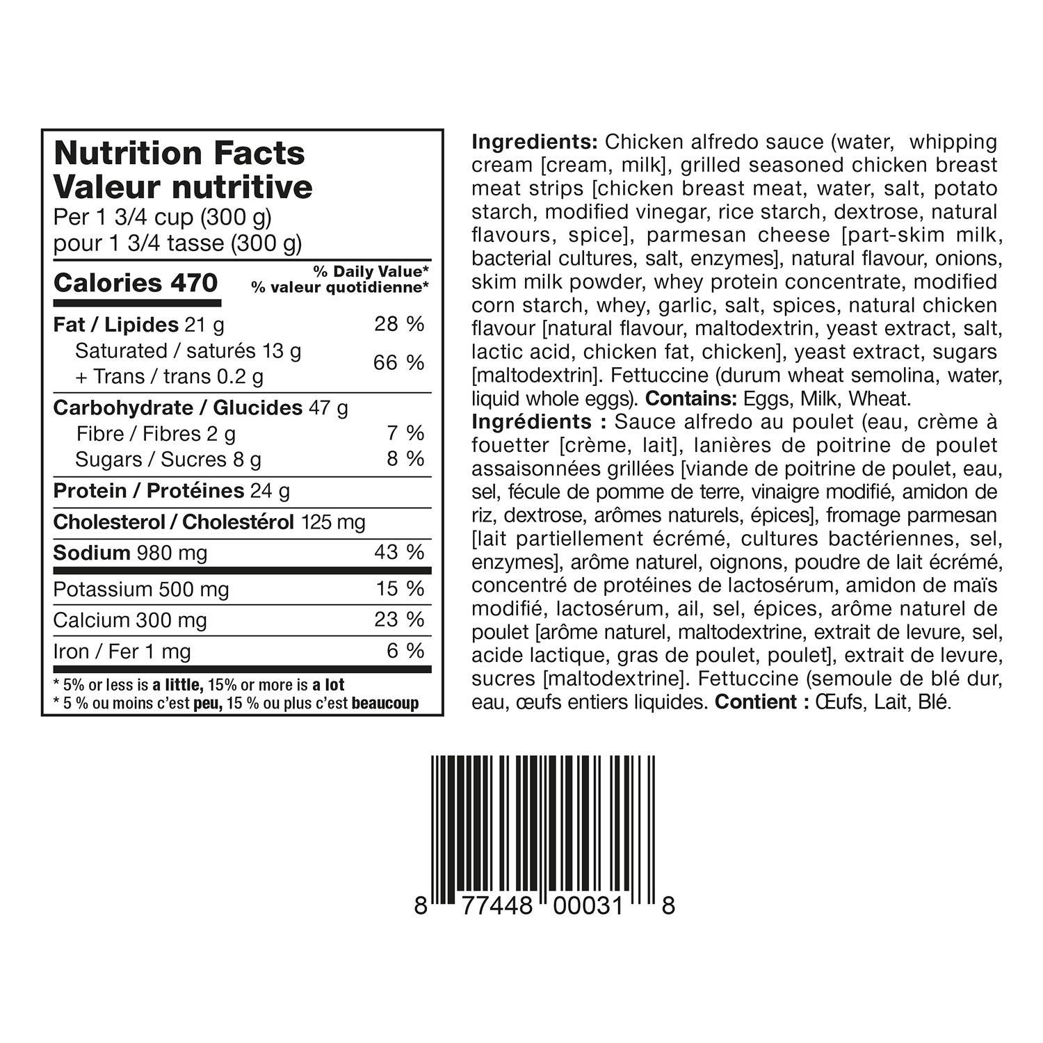 Ingredienti: salsa Alfredo au poulet (eau, crème à fouetter [crème, lait], lanières de poitrine de poulet assaisonnées grillées [viande de poitrine de poulet, eau, sel, fécule de pomme de terre, vinaigre modifié, amidon de riz, destrosio, aromi naturali, épices], fromage parmesan [lait partiellement écrémé, cultures bactériennes, sel, enzimi], arôme naturel, oignons, poudre de lait écrémé, concentré de protéines de lactosérum, amidon de maïs modifié, lactosérum, ail, sel, épices, arôme naturel de poulet [arôme naturel, maltodestrina, estratto de levure, sel, acide lactique, gras de poulet, poulet], extrait de levure, sucres [maltodestrina]. Fettuccine (semoule de blé dur, eau, œufs entiers liquides).