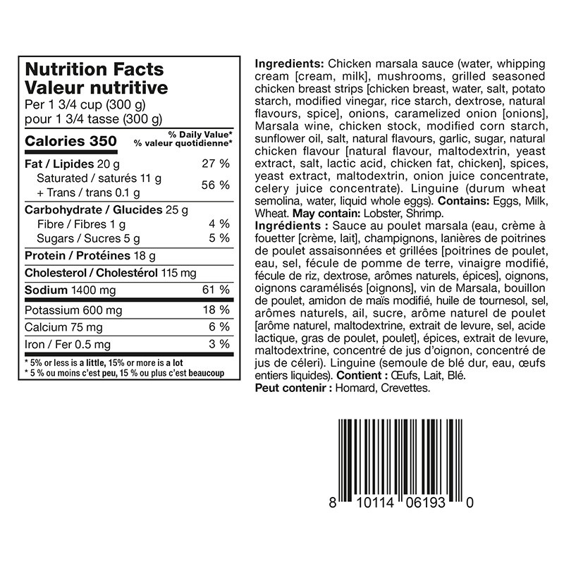 Sauce au poulet marsala (eau, crème à fouetter [crème, lait], champignons, lanières de poitrines de poulet assaisonnées et grillées [poitrines de poulet, eau, sel, fécule de pomme de terre, vinaigre modifié, fécule de riz, dextrose, arômes naturels, épices], oignons, oignons caramélisés [oignons], vin de Marsala, bouillon de poulet, amidon de maïs modifié, huile de tournesol, sel, arômes naturels, ail, sucre, arôme naturel de poulet [arôme naturel, maltodextrine, extrait de levure, sel, acide lactique, gras de poulet, poulet], épices, extrait de levure, maltodextrine, concentré de jus d’oignon, concentré de jus de céleri). Linguine (semoule de blé dur, eau, œufs entiers liquides).Contient : Oeufs, Lait, Blé.