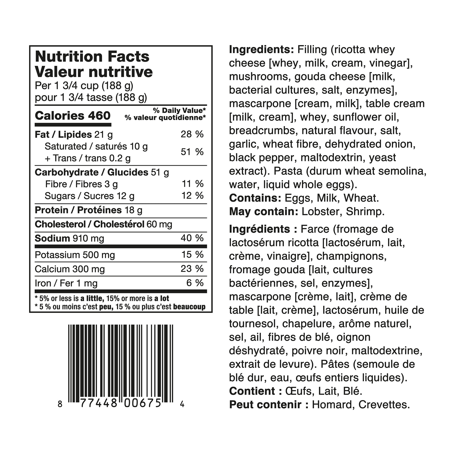 Farce (fromage de lactosérum ricotta [lactosérum, lait, crème, vinaigre], champignons, fromage gouda [lait, cultures bactériennes, sel, enzymes], mascarpone [crème, lait], crème de table [lait, crème], lactosérum, huile de tournesol, chapelure, arôme naturel, sel, ail, fibres de blé, oignon déshydraté, poivre noir, maltodextrine, extrait de levure). Pâtes (semoule de blé dur, eau, œufs entiers liquides).