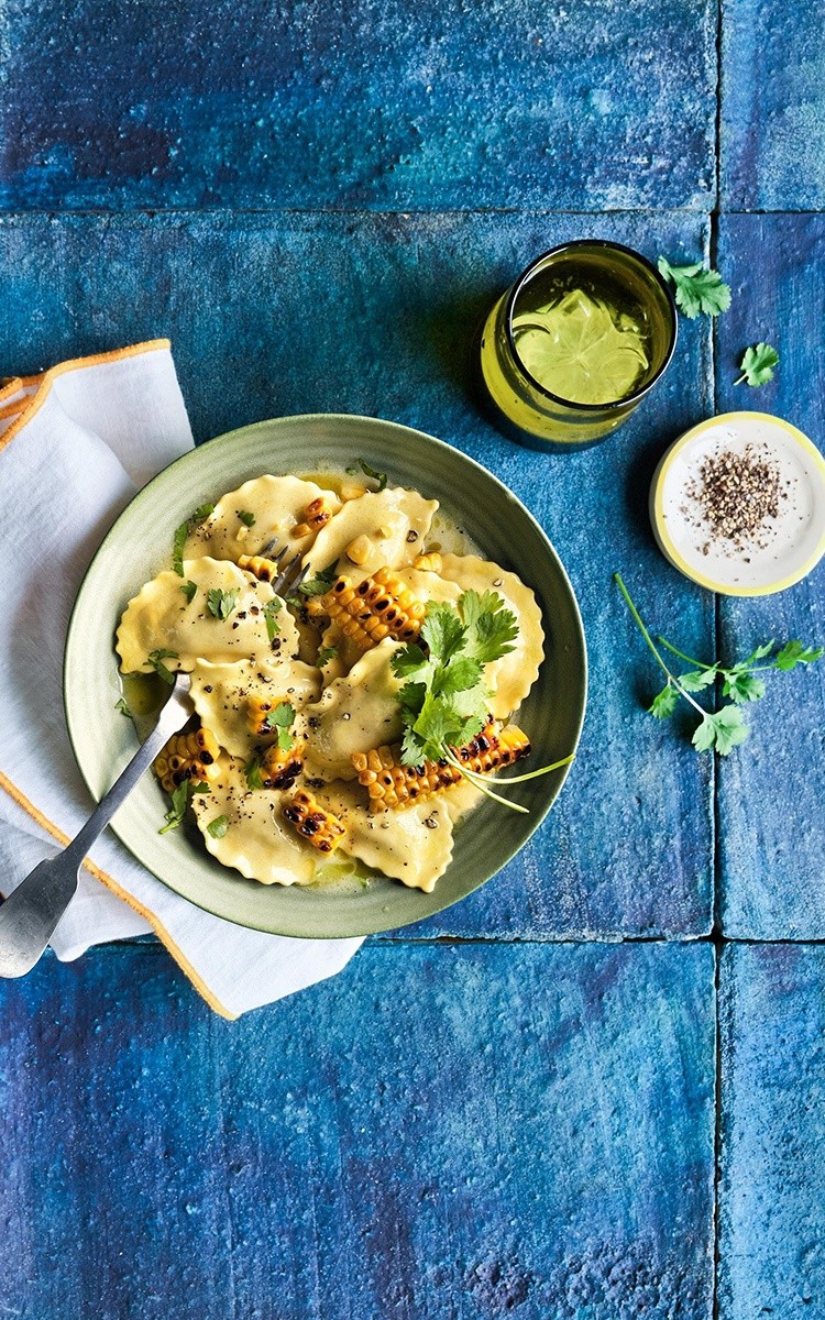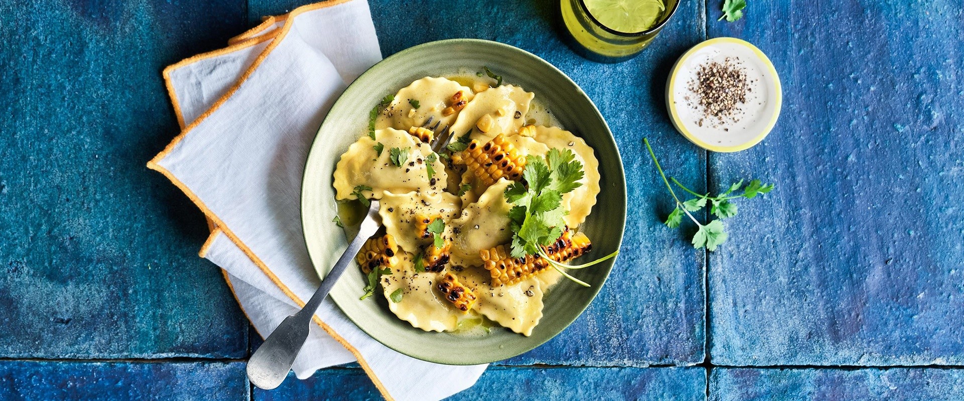Cuire les ravioli selon les instructions sur l’emballage. Égoutter, puis mélanger délicatement les ravioli avec la sauce au beurre, le maïs grillé et la coriandre. Assaisonner avec du sel et du poivre.