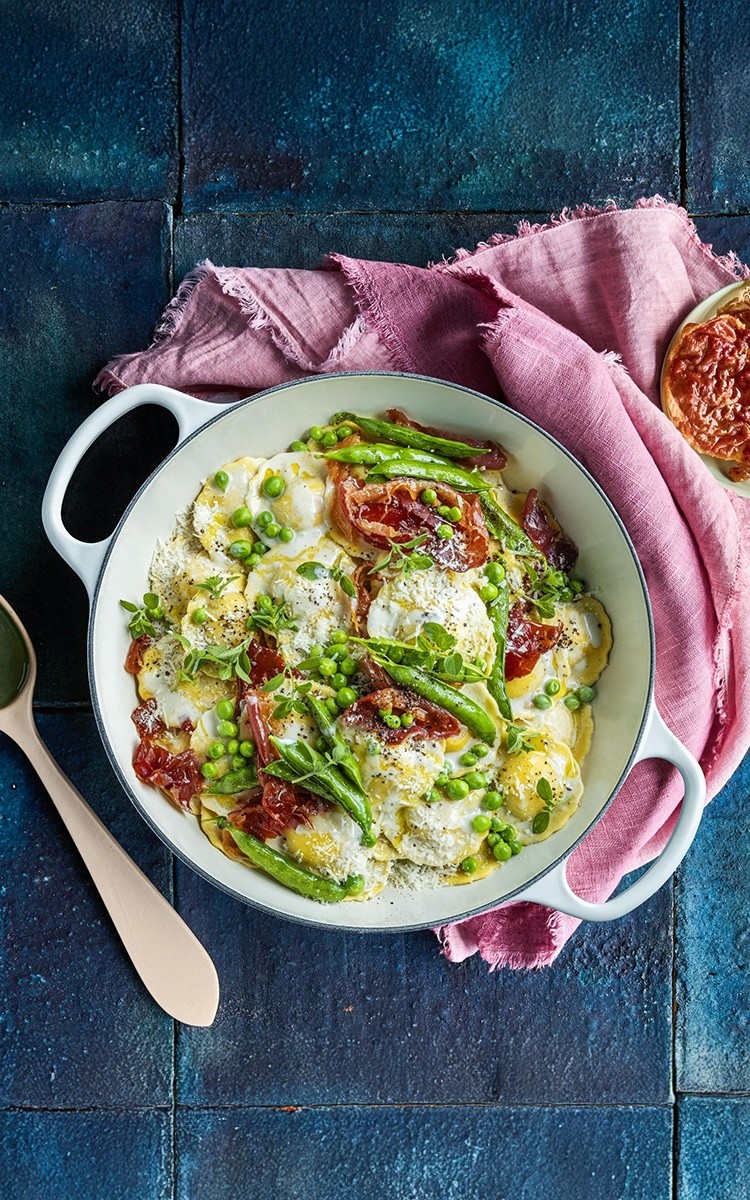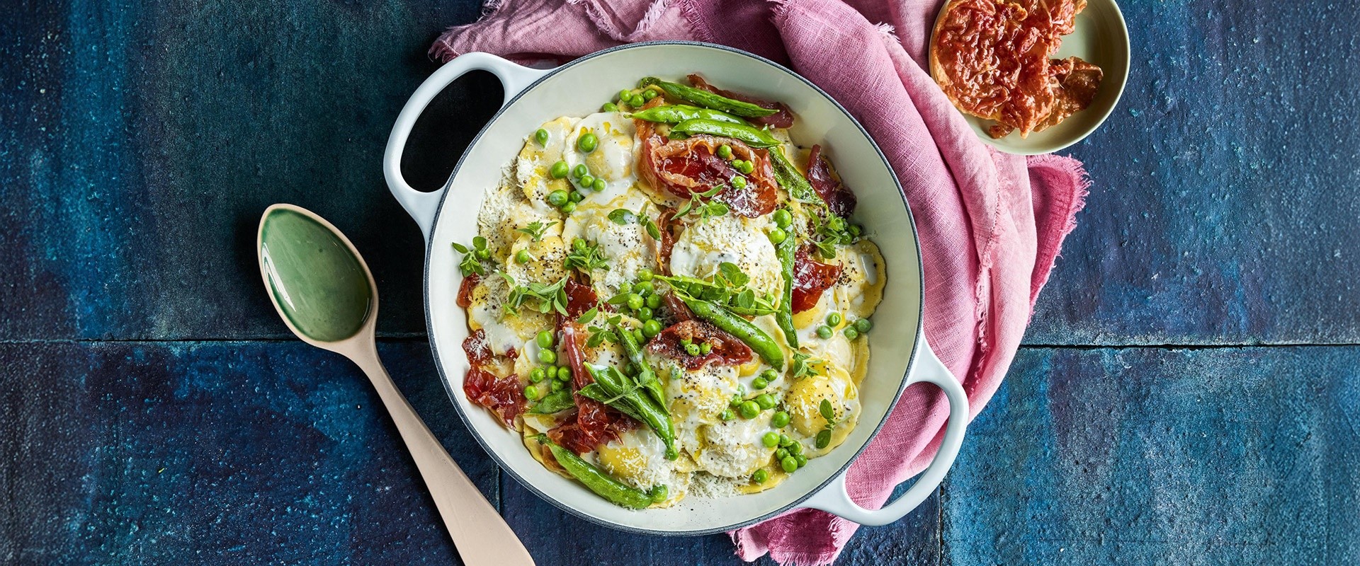 Ravioli aux champignongs, prosciutto, sauce alfredo et petits pois